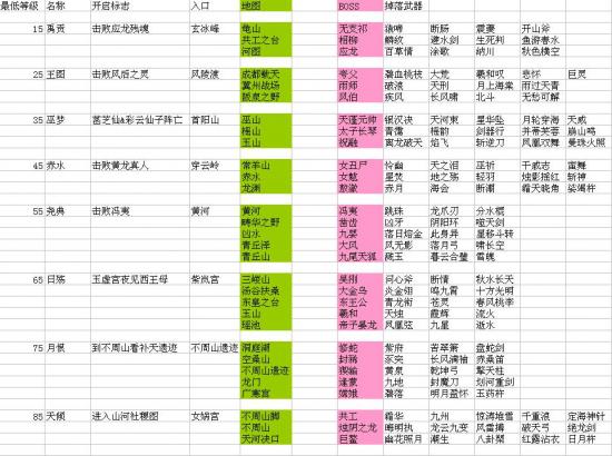 以上是副本的最低进入等级,开启成功的剧情标志,入口位置,副本包含的地图、BOSS和掉落的武器。