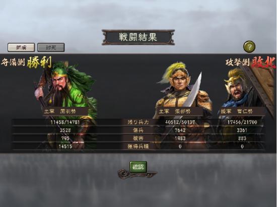 战果(伤亡比例 : 3000 vs 1w3 ...应该入手大部份伤兵...以战养战...曹军再攻两三次也不成问题)
