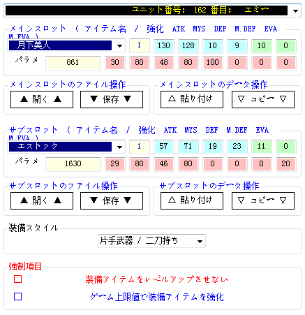 EVA 物理闪避。最高100.高于100会被修正。武器游戏数据不认。战斗中确认。M.EVA 魔法闪避。最高100.高于100会被修正。武器游戏数据不认。战斗中确认。*以上修改如果装备道具升级数据会还原。