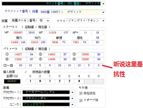 蓝色的数值是现在的角色真实值,红色是角色现在真实值的经验值。例如:主脚HP288.真实值288,经验值28800。经验值的范围是28800-28899,超过28899代表HP升级。改蓝色值会被游戏还原,更改红色经验值就好了。更改完后变换装备数值就会改变了。