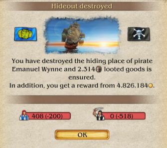 再来了一个轮回把老巢终于端了,不过没截到图,找了另一个海盗的完蛋画面,大家可以看一下四百多万现金和2000多桶物资,发财了...