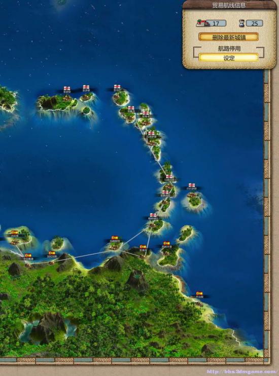 出现大地图后 按鼠标左键逐个点击想贸易的港口 建立一个循环的贸易线路 然后点击右上角的设定 制定相应的策略 一般选择利益就行了 然后点击激活航线 右键退出后这艘船(或一支舰队)就会自动贸易了 当然你也可以自定义详细的贸易策略 不过比较烦