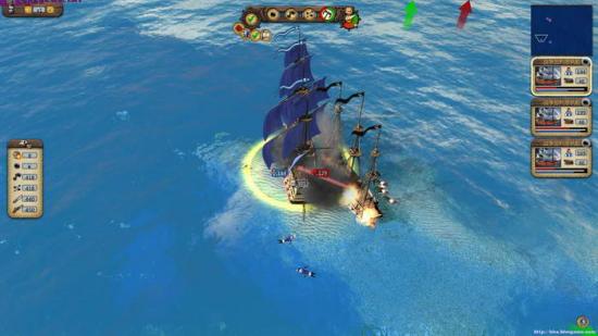 同时参加战斗的只有三艘船 虽然都能选择控制 但同时手动只能控制一艘 另外两艘电脑会自动控制 不过也可以点击正上方左边的图标制定简单的作战方略 想控制另外两艘船只要点击右边船的图标就能直接控制相应的船只了