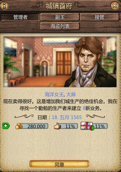 第4点国家声望,这个是本作的一大牵制玩家的设定。因为,这是按照时间来递减的,到了25%就不会减少,需要你做任务,每个港口都有的,主要是没有舰队或仓库不能点击,所以这个也牵涉到了第1个问题。选择港口的问题。这时候你会问,如果港口被其他国家抢了怎么办,这时,最好的办法是等2过开战。或者期待2个国家和平,和平的话2个国家的威望相加再除以2,比如,你主要的威望在英国,有95%,另一个国家的威望你只有25%,那么如果2个国家盟友了后,2个国家的威望都将在60%。这种都是随机事件,我有很愚蒙的时候,就是刚要点接管,结果盟友了~~~~~~~导致接管失败。