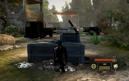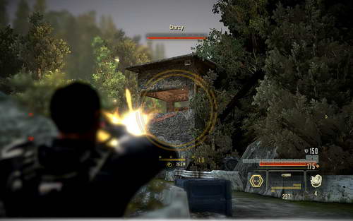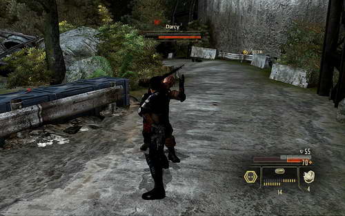 DARCY非常难打。首先这个家伙是躲在岗哨里面放狙击;而且不断的往你这里扔高爆手雷。你几乎没有可以躲避的空间。而且还有上面不断下来的杂兵