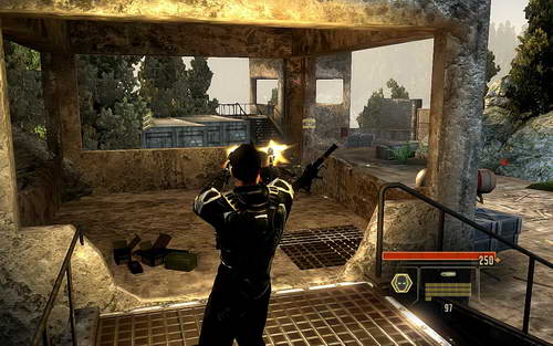 下来的杂兵;建议使用肉搏干掉。这里有个BUG,也就是偶尔你干掉DARCY却发现怎么都无法进入下一个场景了。如果不行的话,就去一边的岗哨拿狙击枪干掉他