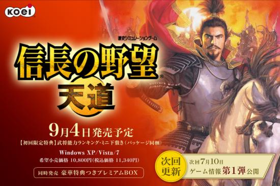KOEI宣布,经典历史模拟游戏《信长之野望》系列PC最新作《信长之野望 天道(信長の野望 天道)》将于9月4日推出,并公布官方网站和初步游戏资讯。这将是名策略游戏《信长之野望》系列最新作品,也是曾在今年4月30日“战国魂Live”活动上宣布的《信长之野望13》正体。