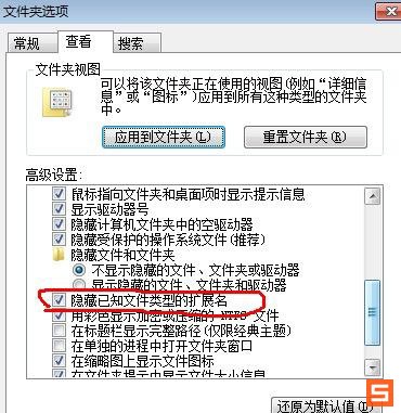 如果有朋友看不见后缀名,那么请你在文件夹中 打开工具——文件夹选项——查看 然后往下面拉 把图中红框内容的勾去掉 然后确定。
