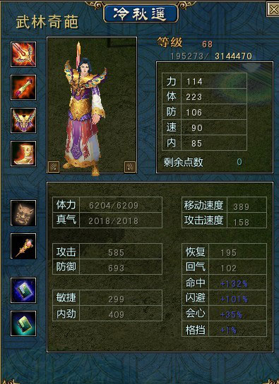 3.关于加点,属性点一般是力或者体,我偏重体,感觉天下无缺加速度没什么用,我速的点才90,后期攻击一样极快,困难模式加体比较保险,前期不容易挂。技能点明玉功一点要MAX,加双速度和命中,效果非常好,几个加攻的被动技能MAX,终极技能不必三个都加,加满幽影醉千丈最佳,范围最大,攻击最高,60多级的小怪全秒。其他2个终极群来1点或者不加。凝霜护体加满,减伤害的,配合高体力打BOSS不容易被秒,噬灵散魂指建议加满,此技能攻击力不弱,而且带负面状态,满级的附带9秒虚弱和13秒卸甲,冷却时间才6秒多。另外凄雨流虹剑是非常好的技能,群攻,最厉害的是这个技能点满重击+16,我用上面图的属性,开这个技能能群伤出7000+,而且要命的是它冷却才2秒,每次放完秒60多级小怪,用个九转巧劲可以随便放。