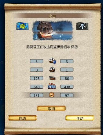 海战的话,如果战力差别够大,直接自动就好了,当然,初次接触这类型游戏,还是手动一把爽爽先……咳咳,也别期待太高哟,毕竟海商王系列主打的还是一个“商”字,当初第一代译者给的这个译名并不负该作之内涵,商贸还是首要的,好吧,不扯其他,开始手动。