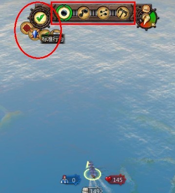 至于上面四种攻击模式,左数第一个是加农弹猛攻,以击沉为目的;第二个是榴弹打船帆,减速为目的;第三个是散弹打水手,减员为目的;第四种则是接舷战,接舷战对操控要求比较高,建议在鼠标右键和空格键的配合下,调整到一个最佳切入角度,并争取利用微操让两船“并行”,理想状态是敌舰呈现紫色外圈,然后两船之间出现那个接舷预备状态图标(即必须保持两船在紫圈范围内有接触,超出紫圈则失去接舷预备状态)。