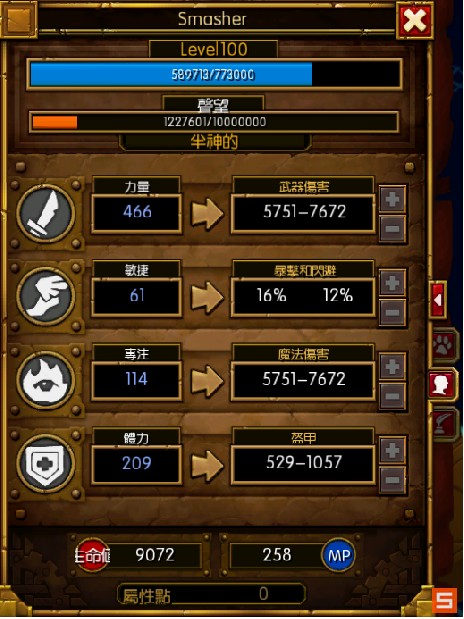 目前是休閒NG+++,不过机体目前小心点可以勉强打Elite的BOSS。点数算是偏力体,不穿装备力敏专体334 , 5, 32 , 164,穿上后为下图