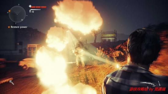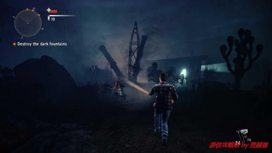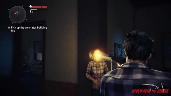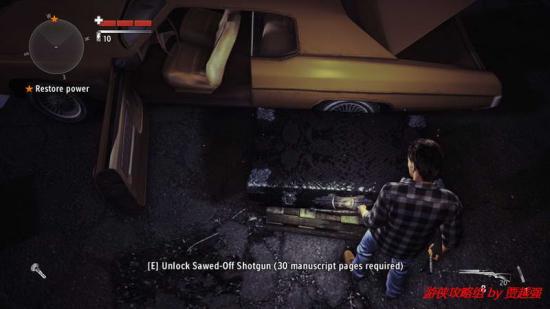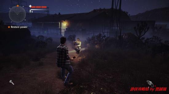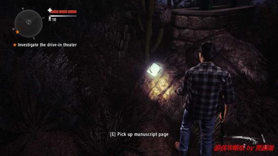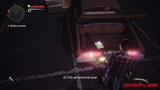 1.开场主角来到露天的汽车影院,先搜索下四周.转身向后跑一段距离后,道路旁的岩石上有一份手稿.跑到游戏边界的时候会刮起一阵邪风充当屏障.这点还是很有创意的,折回.最近的那所屋子后有个垃圾箱,就在附近有份手稿,之后进入那个屋子触发剧情,一个妹子欲火粪身,这是你可以注意到她身上散发的黑雾.交谈后提示拿起发电机厂的钥匙,就挂在室内的墙上