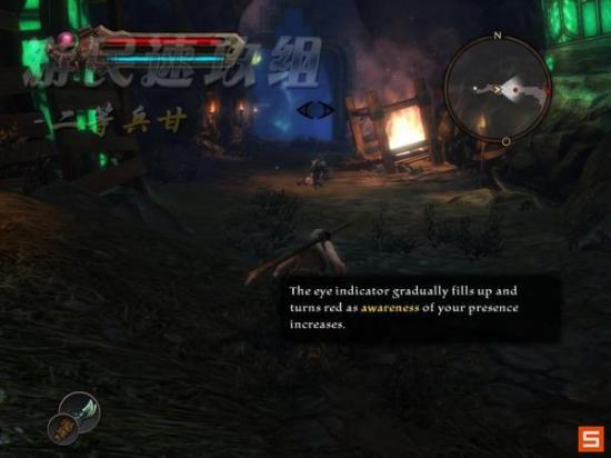 前面有两名正在射箭的敌人,潜行过去消灭其中一名敌人,剩下一名就容易对付了,消灭全部敌人后进入右侧的大门