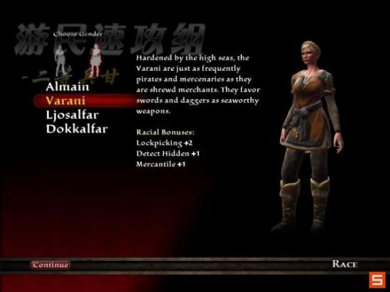 过场动画过后可以选择四个种族的人物,他们拥有不同的技能,有关于四个种族详尽的介绍小弟在这里就不详细说明了,等汉化补丁出来后大家自会知晓,小弟选着的是VARANI种族的妹纸,之后就是按个人的偏好捏人物了