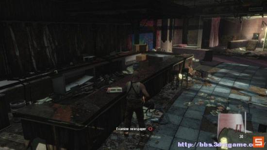 穿过舞池之后,绕着左边前进然后从另一个入口重新进入建筑物。然后观察吧台的上部,你的左手边的报纸,即可发现该线索