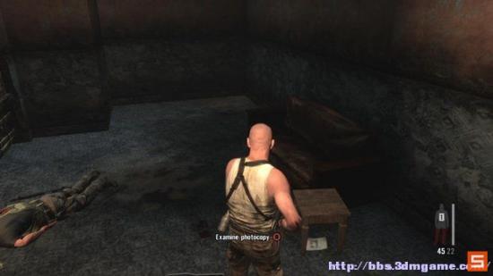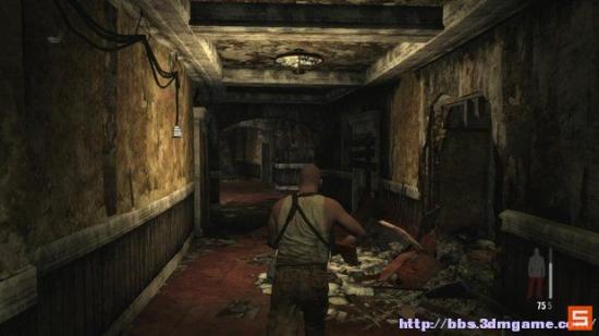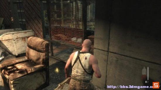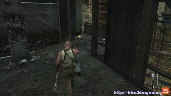 从楼梯爬上来到下一层,MAX将有一段剧情内心独白。你随之进入一个长过道。在你前进的路中,注意你右边有缺口的墙壁,然后从其进入到洗浴间在该房间的地面可以找到该部件。