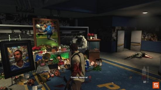 在你清理完毕室内足球场的暴徒之后,转身进入邻近的房间。检查墙上的图片寻找线索