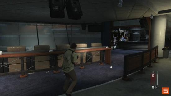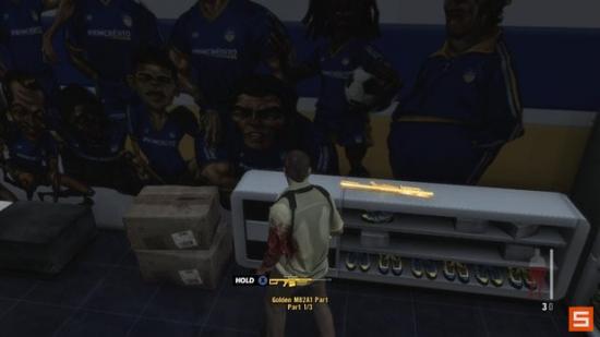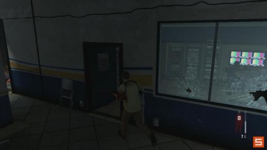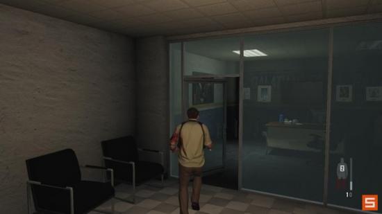 当你发现一个坐在折叠椅上面的受伤暴徒之后,进入一个充满敌人的房间,干掉他们之后,然后检查监控室的上部寻找一个枪械组件