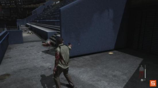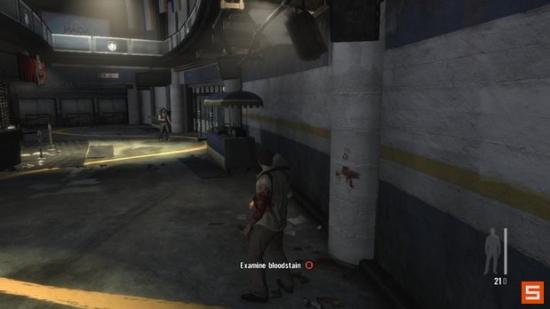 冲过狙击手的射击区域,静静同PASSOS等待直到所有的敌人被清空。然后检查过道右边柱子的血迹手印