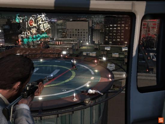 3.马叔及时跳上了赶来协助的直升机.一阵牢骚后拿起步枪狙了停机坪上的敌人.之后别让敌人接近脱逃的拜金女,射杀一路上的敌人,直升机随着妹子来到屋顶上空,等妹子跑进门直升机会因为躲避RPG而把马叔翻出去,悬挂在直升机的底部瞄准敌人,见到飞来的导弹就打爆.之后从直升机摔至平台。