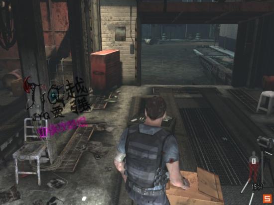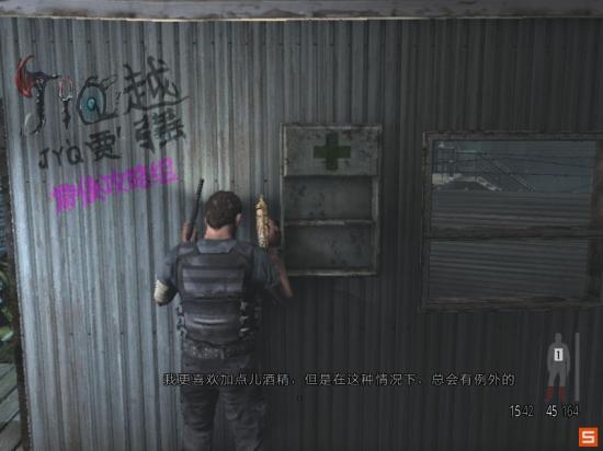 2.之后走到卷闸门处触发子弹时间,用附的冲锋枪扫射对面保龄球瓶般整齐的敌人,附近的两层集装箱上有一处金枪模组,我在不同的路线跳了半天才发现原来E键是攀爬,取得之后最好捡起散弹,之后在穿越集装箱时会在狭窄的空间内遇敌,之后来到白色的门前,进入到之前在监控里看到的房间,桌上有止疼片和播放新闻的电视,一旁还有可以互动的摄像机。