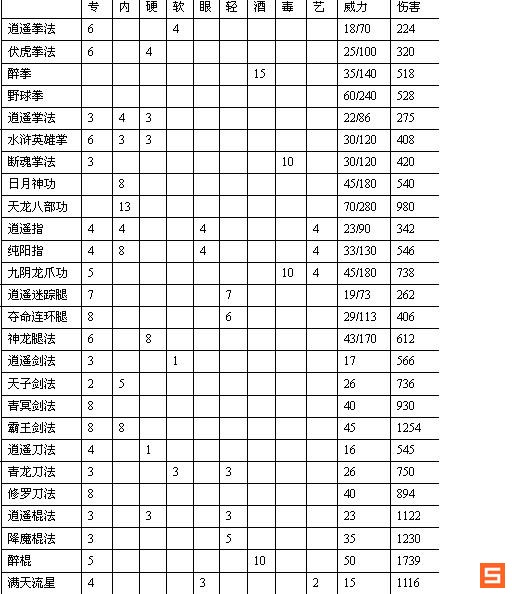 b.表格中有软功加成的依然要计算 例如 逍遥拳法计算时候不仅要加成软功最后的3成还要计算软功本身加的4成