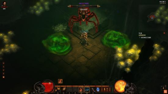 在战斗中蛛后会召唤其它小蜘蛛助拳,不过这些喽萝跟骷髅王的小兵差不多,不但不会造成威胁,反而可以拿来魂灵收割兼打血球,数量不多时甚至连AE技都不用就能解决。比较要留意的是这边怪物会有些许毒抗,如果觉得伤害值没有发挥出水准,可以试著切换符文改变伤害属性。