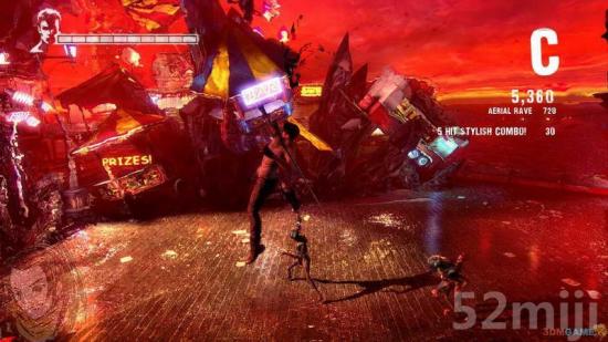这就说到战斗系统上了。我们得明确地说明DmC不是一个依靠技术创造出打击感的游戏,它不需要记住连招的按键,你不需要准确的输入这些连招按键,而且也不需要研究武器是如何有效使用。