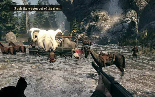 大家的精神立刻都紧张起来 Juarez大喊一声“快走” 抓紧拼命的赶路 但越急越乱 马车轮子陷进瀑布前的河泥中 得到任务 把马车从河泥中推出来