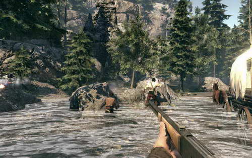 这里有不少的印第安人都边隐蔽在树林里边向你射击