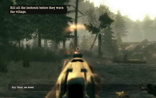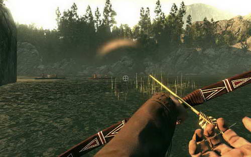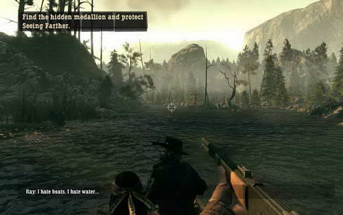 消灭挡住去路的敌人 三人来到河边搭上了小木舟 但刚出发就碰到两支印第安人的小舟拦截 别客气干掉他们 注意不能让他们太接近 否则Seeing Farther死掉任务就失败 另外建议你先把划船的干掉 这样他们的船就停了