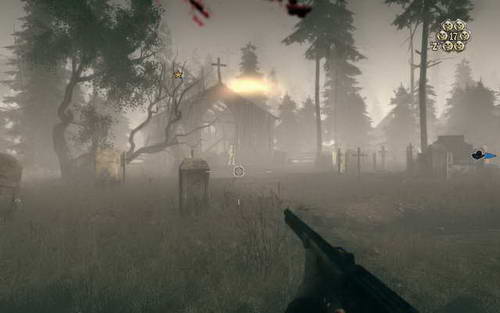 一路顺着任务标志 通过墓地 前往废弃教堂 在教堂门口遭到机关枪的阻击 利用碑石从侧面攻过去