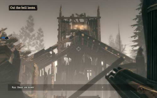 干掉教堂门口和教堂内的敌人后 看到Barnsby这家伙还在钟楼那里用炸药和手枪负隅顽抗 用门口的机关枪击中他几次后 得到任务 射断钟绳 其实就是连续射击钟 知道钟楼因为不堪重负垮塌位置 任务完成 Barnsby这样竟然都没死 命真大