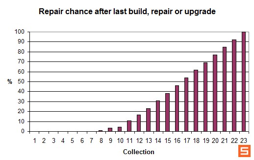 A:建筑的升级会附带维修效果!!!!在维修或升级之后,建筑的第一到第七次收获是不会产生维修的,第八次开始会逐渐增加维修概率,直到第23次,概率是百分之100(也就是如果你的建筑物坚持了22次没有维修,第23次一定维修)。如下图所示。
