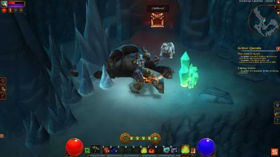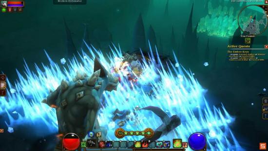 因为哥布林血少,沿路基本炸药开道,Boss拿镰刀,主要技能是区域的冰攻击和冰属性的拍击,注意躲避,难度不大,打完Boss即取得第二块宝石。