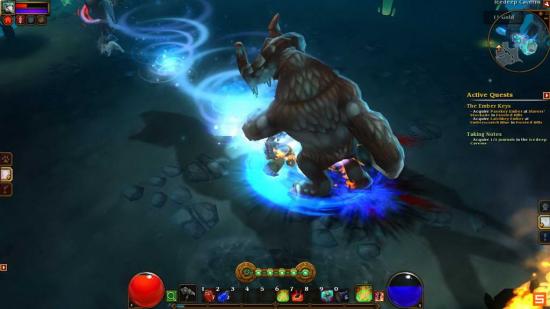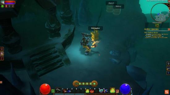 主线任务需要的第二颗宝石存在于地图的东南部叫Emberscatch Mine的地方。场景中大部分为哥布林怪物,无难度,地图上都是爆桶,速度清场,在左下角取得第二块正方形宝石。