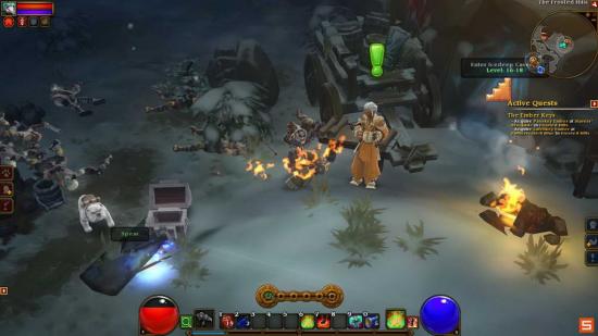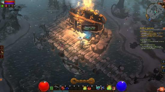 The FROSTEDHILLS地图小站上方有一个人形怪的营地,清理营地,杀死中间的精英怪开启祭坛取得第一个三角形宝石,然后进入Slavers Den,清理小怪,救出NPC。地图中战斗难度不大,清理所有小怪打开牢笼即可救出NPC。