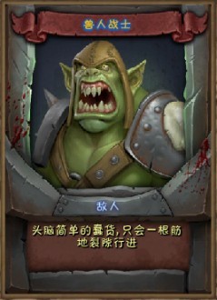 近战物理,速度中等,伤害中等,典型的炮灰型兵种,成群结队的出洞,十字弩爆头可以秒杀,吃各种陷阱和魔法效果,后期会加强成持盾兽人,盾牌可以抵御一次攻击(包括致命攻击,如刃墙等),对付这个兵种远了就一个一个点,近了可以配合旋风腰带,以及3种戒指来应付,另外要注意的是,噩梦难度兽人战士的行走路线将会是以冲到裂隙为主(距离裂隙较近就会放弃攻击玩家而跑进裂隙,普通难度这个判定很远)