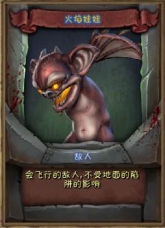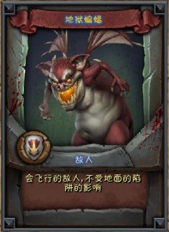 空中远程,速度比地狱蝙蝠快一些,无视地形飞行(以距离裂隙最近的路线飞行),对进入射程的目标施放火球,任何攻击它一下都可以击杀掉,这小家伙成群结队的飞行,虽然它施放的火球攻击不高,但是群体齐发的时候还是很致命的,所以,在其出现后,尽快杀掉吧,寒冰坠饰左键的5发冰弹对付它依然给力。个别关卡布置一些弓箭手对付这个兵种很不错(恩弓箭手是很2,就当做是防止它飞到裂隙的保障吧)