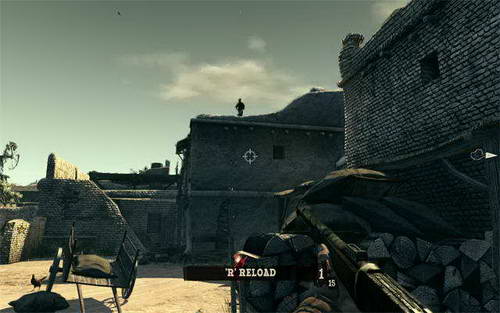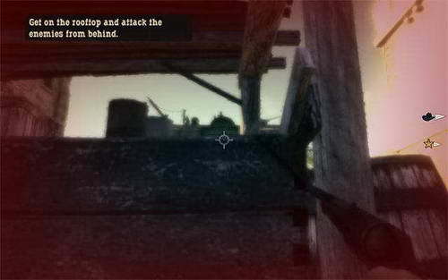 左边走突然遇到对面楼顶的三个狙击手 千万别贸然冲出去(我只是为了截图没法子) 这时Ray负责吸引火力 而Thomas得到任务 从屋顶绕道敌人后面干掉他们 (这里如果控制的是Ray 那你的任务就是在箱子这里或者墙那边吸引对方注意力 而AI控制的Thomas就会绕道攻击敌人背后)