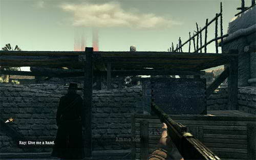 完成任务后 从侧面跳下房子 跟着Ray继续前进 到了一个院子的门口 又要开始合作了 注意进去后敌人很多 对方还会扔炸药 注意隐蔽
