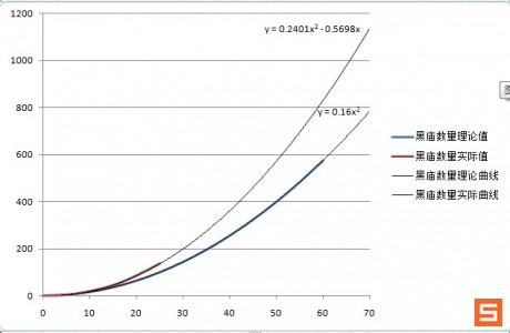 将X=28代入曲线,发现结果吻合良好。由此可以得出当地皮为60*60时,黑庙数量可以达到830个。此数据可以作为一个估计值在以后的收益讨论中直接使用。