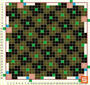取一块28*28的地皮,以梅花桩法摆2*2黑庙为例进行讨论。绿色和蓝色方块为道路,黑色、棕色和粉色方块为黑庙。