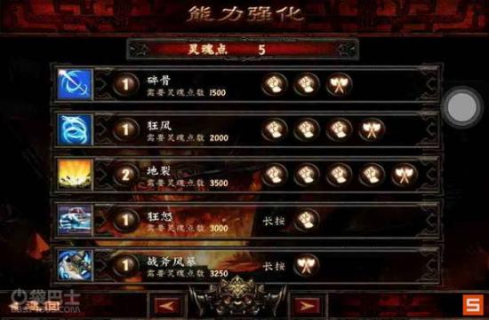 ① 点击后召唤出能力强化菜单,可以使用魂点来强化角色的各项技能和属性。