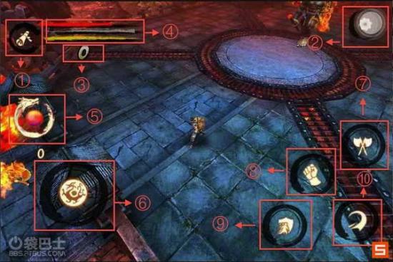 ⑨ 防御,点击后使角色进入防御状态,防御+方向可控制角色进行翻滚闪避。