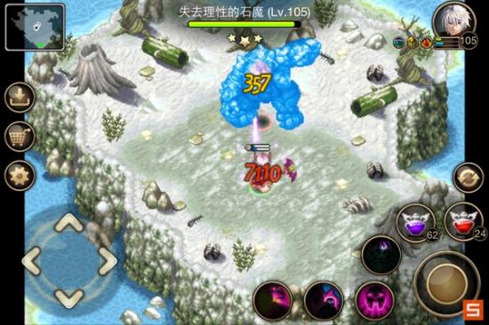 第一轮对攻,双方开大招对A,技能从右往左放,血之祭奠冷却时间才4秒,真的很给力,截图的时候差不多已经冷却完了。死亡之棒的寒气直接把石魔打成了蓝色,我也给它砸了4下,最后一下吃了个暴击,就是图中的7110(普通攻击是3555),残血赶快跑,再给砸一下就挂了。。。