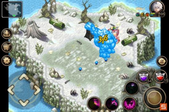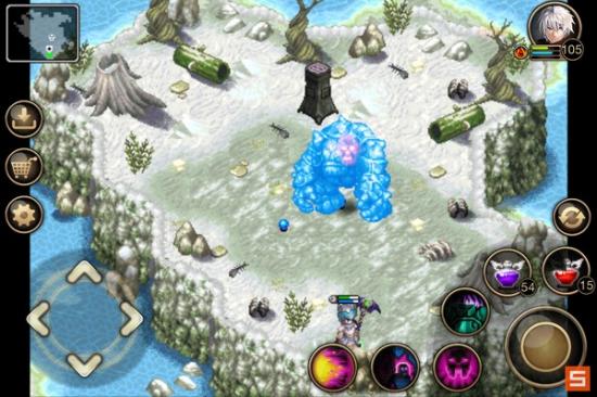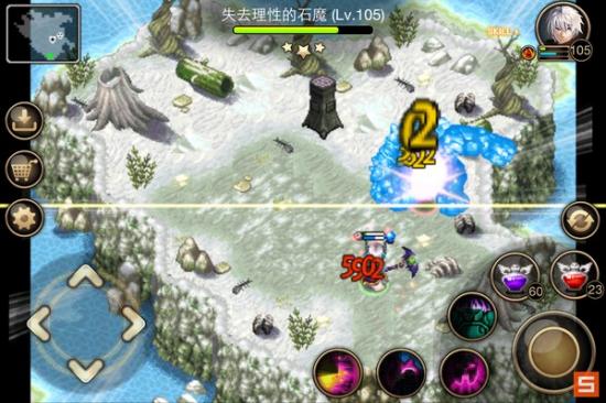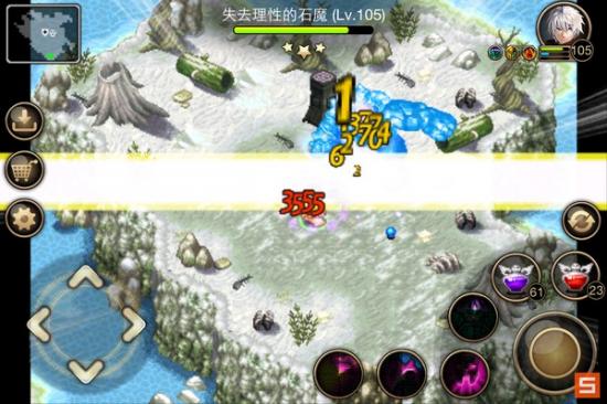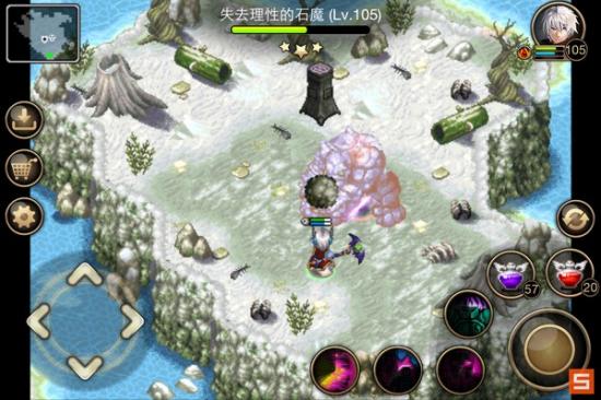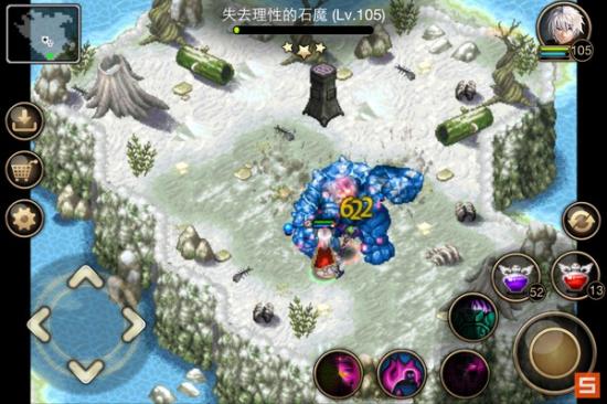 其实下图这种情况是有点危险的,就是它站在地图中间并且面朝你。这时只要它向前移动一点你进入它的射程,接下来它就会追着你打,连续4次以上的快速攻击,而你没有魔甲,非常难抗。于是就要和石魔斗智斗勇,先往右下角跑虚晃一枪,它就会向右移动。。。这时机会就来了,迅速转身往左跑,然后贴着左边逃到左上角,到上面跟他周旋。。。