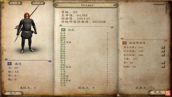 ①属性:如图。智力魅力都只加到9点,而魅力一开始就是9,压根没加。智力加到9,完全是为了物品管理的3级,个人觉得这样比较够用。实际上,还可以进一步压缩,智力完全不加。敏是18,对付库吉特大部队以外的野战部队,6骑术完全够用,而6骑射更是早就够用。剩余点数全点给力。等级21力量18的时候,已经是个合格的单人狙击骑,目前我力量已经30,算是顶峰了。