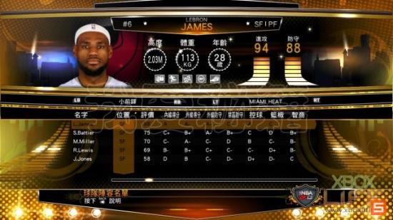 SF(Small Forward)小前锋素质参考对象:LeBron Raymone James(Miami Heat)。攻守兼备的SF,算是整个球队中仅次于SG的得分能手,就以L. James在游戏中的各项能力设定来说,能力高达99点的「内线投篮」、「上篮」、「体力」,光这三点就能在篮下把对手吃死死的。几乎是全能型球员的SF,得具有一定程度的外线冷箭能力、传/接球能力,在必要的情况下也得上去抓几个防守篮板,因此是大三元、MVP的常客,在《灌篮高手》中就是六、七年级生争相模仿的流川枫角色。